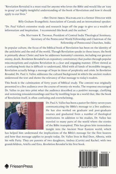 Dr. Paul A. Vallee has been a pastor for thirty-seven years communicating the Bible's message to a live audience. He has also worked on graduate and post-graduate courses and graduated from a number of theological institutions. In addition to his studies, Dr. Vallee has traveled to many parts of the world where the stories of the Bible transpired. This has given him tremendous insight into the Ancient Near Eastern world, which has helped him understand the implications of the Bible's message for the first hearers and how that message applies to people today. Dr. Vallee lives in Red Deer, Alberta, with his wife Patty and are parents of two daughters, Andrea (Curtis) and Rachel; with two grandchildren, Ariella and Ezra. Revelation Revealed is his first book.