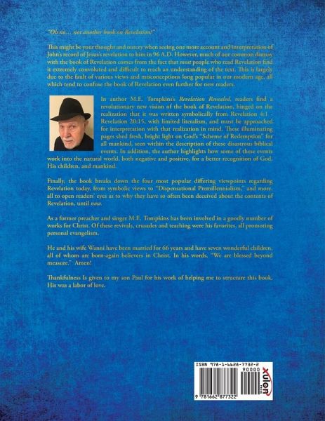 "Oh no... not another book on Revelation!" This might be your thought and outcry when seeing one more account and interpretation of John's record of Jesus's revelation to him in 96 A.D. However, much of our common dismay with the book of Revelation comes from the fact that most people who read Revelation find it extremely convoluted and difficult to reach an understanding of the text. This is largely due to the fault of various views and misconceptions long popular in our modern age, all which tend to confuse the book of Revelation even further for new readers. In author M.E. Tompkins's Revelation Now, readers find a revolutionary new vision of the book of Revelation, hinged on the realization that it was written symbolically from Revelation 4:1 - Revelation 20:15, with limited literalism, and must be approached for interpretation with that realization in mind. These illuminating pages shed fresh, bright light on God's "Scheme of Redemption" for all mankind, seen within the description of these disastrous biblical events. In addition, the author highlights how some of these events work into the natural world, both negative and positive, for a better recognition of God, His children, and mankind. Finally, the book breaks down the four most popular differing viewpoints regarding Revelation today, from symbolic views to "Dispensational Premillennialism," and more, all to open readers' eyes as to why they have so often been deceived about the contents of Revelation, until now. As a former preacher and singer M.E. Tompkins has been involved in a goodly number of works for Christ. Of these revivals, crusades and teaching were his favorites, all promoting personal evangelism. He and his wife Wanni have been married for 66 years and have seven wonderful children, all of whom are born-again believers in Christ. In his words, "We are blessed beyond measure." Amen! Thankfulness Is given to my son Paul for his work of helping me to structure this book. His was a labor of love.