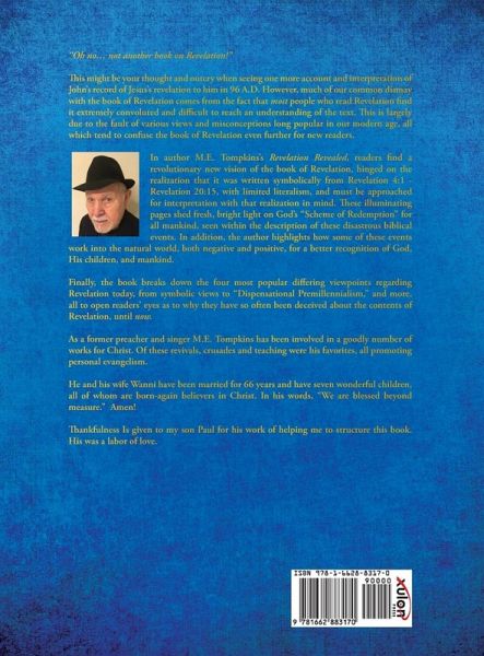 "Oh no... not another book on Revelation!" This might be your thought and outcry when seeing one more account and interpretation of John's record of Jesus's revelation to him in 96 A.D. However, much of our common dismay with the book of Revelation comes from the fact that most people who read Revelation find it extremely convoluted and difficult to reach an understanding of the text. This is largely due to the fault of various views and misconceptions long popular in our modern age, all which tend to confuse the book of Revelation even further for new readers. In author M.E. Tompkins's Revelation Now, readers find a revolutionary new vision of the book of Revelation, hinged on the realization that it was written symbolically from Revelation 4:1 - Revelation 20:15, with limited literalism, and must be approached for interpretation with that realization in mind. These illuminating pages shed fresh, bright light on God's "Scheme of Redemption" for all mankind, seen within the description of these disastrous biblical events. In addition, the author highlights how some of these events work into the natural world, both negative and positive, for a better recognition of God, His children, and mankind. Finally, the book breaks down the four most popular differing viewpoints regarding Revelation today, from symbolic views to "Dispensational Premillennialism," and more, all to open readers' eyes as to why they have so often been deceived about the contents of Revelation, until now. As a former preacher and singer M.E. Tompkins has been involved in a goodly number of works for Christ. Of these revivals, crusades and teaching were his favorites, all promoting personal evangelism. He and his wife Wanni have been married for 66 years and have seven wonderful children, all of whom are born-again believers in Christ. In his words, "We are blessed beyond measure." Amen! Thankfulness Is given to my son Paul for his work of helping me to structure this book. His was a labor of love.