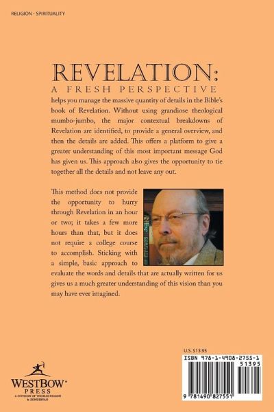 Revelation: A Fresh Perspective helps you manage the massive quantity of details in the Bible's book of Revelation. Without using grandiose theological mumbo-jumbo, the major contextual breakdowns of Revelation are identified, to provide a general overview, and then the details are added. This offers a platform to give a greater understanding of this most important message God has given us. This approach also gives the opportunity to tie together all the details and not leave any out. This method does not provide the opportunity to hurry through Revelation in an hour or two; it takes a few more hours than that, but it does not require a college course to accomplish. Sticking with a simple, basic approach to evaluate the words and details that are actually written for us gives us a much greater understanding of this vision than you may have ever imagined.