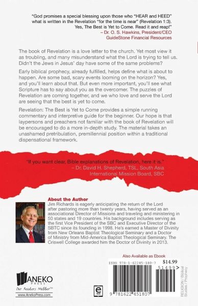 The book of Revelation is a love letter to the church. Yet most view it as troubling, and many misunderstand what the Lord is trying to tell us. Didn't the Jews in Jesus' day have some of the same problems? Early biblical prophecy, already fulfilled, helps define what is about to happen. Are some bad, scary events looming on the horizon? Yes, and you'll learn about that. But even more important, you'll see what Scripture has to say about you as the overcomer. The puzzles of Revelation are coming together, and we who love and serve the Lord are seeing that the best is yet to come. Revelation: The Best is Yet to Come provides a simple running commentary and interpretive guide for the beginner. Our hope is that laypersons and preachers not familiar with the book of Revelation will be encouraged to do a more in-depth study. The material takes an unashamed pretribulation, premillennial position within a traditional dispensational framework.
