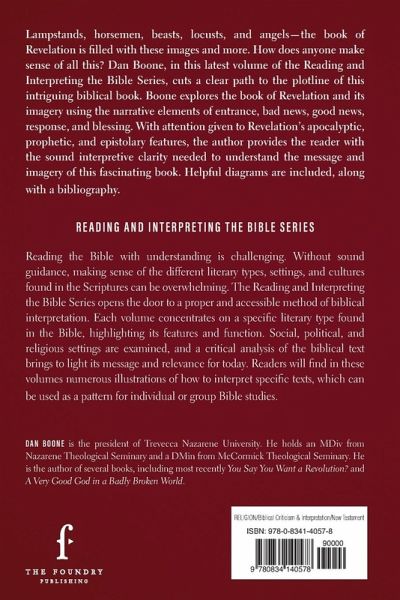 Lampstands, horsemen, beasts, locusts, and angels-the book of Revelation is filled with these images and more. How does anyone make sense of all this? Dan Boone, in this latest volume of the Reading and Interpreting the Bible Series, cuts a clear path to the plotline of this intriguing biblical book. Boone explores the book of Revelation and its imagery using the narrative elements of entrance, bad news, good news, response, and blessing. With attention given to Revelation's apocalyptic, prophetic, and epistolary features, the author provides the reader with the sound interpretive clarity needed to understand the message and imagery of this fascinating book. Helpful diagrams are included, along with a bibliography. Reading the Bible with understanding is challenging. Without sound guidance, making sense of the different literary types, settings, and cultures found in the Scriptures can be overwhelming. The Reading and Interpreting the Bible Series opens the door to a proper and accessible method of biblical interpretation. Each volume concentrates on a specific literary type found in the Bible, highlighting its features and function. Social, political, and religious settings are examined, and a critical analysis of the biblical text brings to light its message and relevance for today. Readers will find in these volumes numerous illustrations of how to interpret specific texts, which can be used as a pattern for individual or group Bible studies.