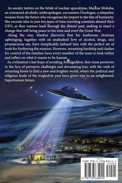As society teeters on the brink of nuclear apocalypse, Markus Moksha, an oversexed alcoholic anthropologist, encounters Dordogne, a telepathic woman from the future who recognizes his import to the fate of humanity. She recruits him to join her team of time-traveling scientists aboard their UFO, as they venture back through the distant past, seeking to enact a change that will bring peace to his time and avert the Great War. Along the way, Markus discovers that his loathsome christian upbringing, together with an unabashed love of alcohol, drugs, and promiscuous sex, have inexplicably imbued him with the perfect set of tools for furthering the mission. However, mounting hardship and clashes for control of the timeline force every member of the team to look within and reflect on what it means to be human. As civilization's last hope of avoiding Armageddon, they must persevere in the face of pervasive challenges and devastating loss, with the wish of returning home to find a new and brighter world, where the political and religious feuds of the troglodyte past have given way to an enlightened, Superhuman future.