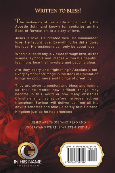 WRITTEN TO BE A BLESSING The testimony of Jesus Christ, penned by the Apostle John and known for centuries as the Book of Revelation, is a story of love. Jesus is love. He created love. He commanded love. He taught love. Everything he did showed his love. His testimony can only be about love. When his testimony is viewed through love, all the visions, symbols and images within his beautiful testimony lose their mystery and become clear. Are they scary and frightening? Absolutely not! Every symbol and image in the Book of Revelation brings us good news and tidings of great joy. They are given to comfort and bless and remind us that no matter how difficult things may become in this world or how many obstacles Christ's enemy may lay before the redeemed, our triumphant Saviour will deliver us from all the devil's schemes and take us safely to his eternal Kingdom just as he has promised. Blessed are those who read and understand what is written... (Rev.1:3) About the Author: Monica Bennett-Ryan is a life-long Christian and an award-winning author. She has authored several books, including VIRTUAL to REALITY, the award winning children's version of REVELATION A Love Story. You can read more about these books and her other titles at: www.inhisname.com.au