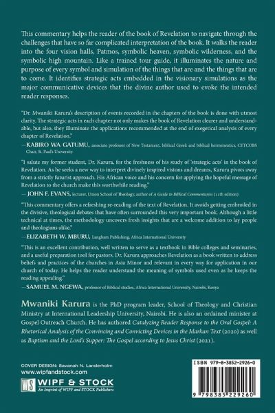 This commentary helps the reader of the book of Revelation to navigate through the challenges that have so far complicated interpretation of the book. It walks the reader into the four vision halls, Patmos, symbolic heaven, symbolic wilderness, and the symbolic high mountain. Like a trained tour guide, it illuminates the nature and purpose of every symbol and simulation of the things that are and the things that are to come. It identifies strategic acts embedded in the visionary simulations as the major communicative devices that the divine author used to evoke the intended reader responses.