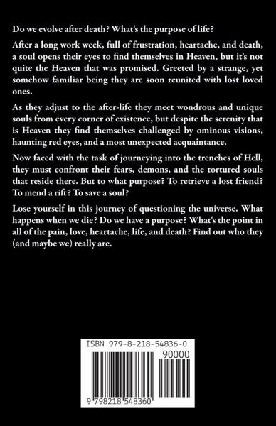 Do we evolve after death? What's the purpose of life? After a long work week, full of frustration, heartache, and death, a soul opens their eyes to find themselves in Heaven, but it's not quite the Heaven that was promised. Greeted by a strange, yet somehow familiar being they are soon reunited with lost loved ones. As they adjust to the after-life they meet wondrous and unique souls from every corner of existence, but despite the serenity that is Heaven they find themselves challenged by ominous visions, haunting red eyes, and a most unexpected acquaintance. Now faced with the task of journeying into the trenches of Hell, they must confront their fears, demons, and the tortured souls that reside there. But to what purpose? To retrieve a lost friend? To mend a rift? To save a soul? Lose yourself in this journey of questioning the universe. What happens when we die? Do we have a purpose? What's the point in all of the pain, love, heartache, life, and death? Find out who they (and maybe we) really are.