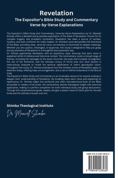 Revelation The Expositor's Bible Study and Commentary, Verse-by-Verse Explanations by Dr. Maxwell Shimba offers a detailed and accessible exploration of the Book of Revelation. Known for its complex imagery and prophetic symbolism, Revelation has been a source of wonder, mystery, and even confusion for many readers. Dr. Shimba's work demystifies this final book of the Bible, providing clear, verse-by-verse commentary to illuminate its deeper meanings. Whether you are a pastor, theologian, or layperson, this study is designed to help you grasp the key elements of Revelation in a thoughtful and systematic way. Dr. Shimba approaches Revelation with an expository style, ensuring that each verse is explained within its biblical and historical context. The commentary covers a broad range of themes, including the messages to the seven churches, the seals and trumpets of judgment, the rise of the Antichrist, and the ultimate victory of Christ over evil. Each section is meticulously analyzed to reveal the spiritual significance of John's apocalyptic vision. Throughout the study, Dr. Shimba emphasizes how the timeless truths of Revelation apply to believers today, offering hope, encouragement, and a call to faithful endurance in the face of trials. The Expositor's Bible Study and Commentary is an invaluable resource for anyone looking to deepen their understanding of Revelation. By breaking down each verse and explaining its significance, Dr. Shimba makes this profound and often misunderstood book of the Bible accessible to readers of all levels. His commentary blends theological insight with practical application, making it a perfect companion for both individual study and group discussions. Through this comprehensive guide, readers will gain a clearer vision of God's plan for the end times and His ultimate triumph over evil.
