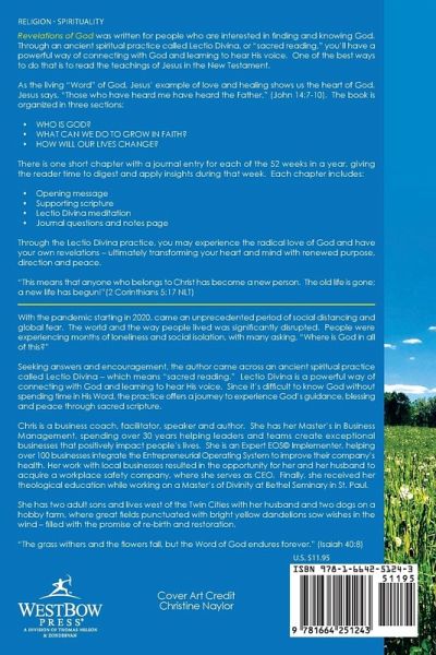 Revelations of God was written for people who are interested in finding and knowing God. Through an ancient spiritual practice called Lectio Divina, or "sacred reading," you'll have a powerful way of connecting with God and learning to hear His voice. One of the best ways to do that is to read the teachings of Jesus in the New Testament. As the living "Word" of God, Jesus' example of love and healing shows us the heart of God. Jesus says, "Those who have heard me have heard the Father," (John 14:7-10). The book is organized in three sections: ¿ WHO IS GOD? ¿ WHAT CAN WE DO TO GROW IN FAITH? ¿ HOW WILL OUR LIVES CHANGE? There is one short chapter with a journal entry for each of the 52 weeks in a year, giving the reader time to digest and apply insights during that week. Each chapter includes: ¿ Opening message ¿ Supporting scripture ¿ Lectio Divina meditation ¿ Journal questions and notes page Through the Lectio Divina practice, you may experience the radical love of God and have your own revelations - ultimately transforming your heart and mind with renewed purpose, direction and peace. "This means that anyone who belongs to Christ has become a new person. The old life is gone; a new life has begun!"(2 Corinthians 5:17 NLT)