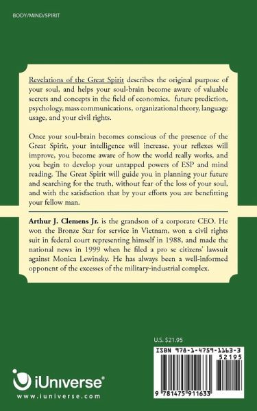 Revelations of the Great Spirit describes the original purpose of your soul, and helps your soul-brain become aware of valuable secrets and concepts in the fi eld of economics, future prediction, psychology, mass communications, organizational theory, language usage, and your civil rights. Once your soul-brain becomes conscious of the presence of the Great Spirit, your intelligence will increase, your refl exes will improve, you become aware of how the world really works, and you begin to develop your untapped powers of ESP and mind reading. The Great Spirit will guide you in planning your future and searching for the truth, without fear of the loss of your soul, and with the satisfaction that by your eff orts you are benefitting your fellow man.