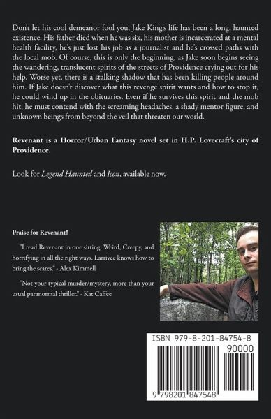 Don't let his cool demeanor fool you, Jake King's life has been a long, haunted existence. His father died when he was six, his mother is incarcerated at a mental health facility, he's just lost his job as a journalist and he's crossed paths with the local mob. Of course, this is only the beginning, as Jake soon begins seeing the wandering, translucent spirits of the streets of Providence crying out for his help. Worse yet, there is a stalking shadow that has been killing people around him. If Jake doesn't discover what this revenge spirit wants and how to stop it, he could wind up in the obituaries. Even if he survives this spirit and the mob hit, he must contend with the screaming headaches, a shady mentor figure, and unknown beings from beyond the veil that threaten our world. Revenant is a Horror/Urban Fantasy novel set in H.P. Lovecraft's city of Providence.