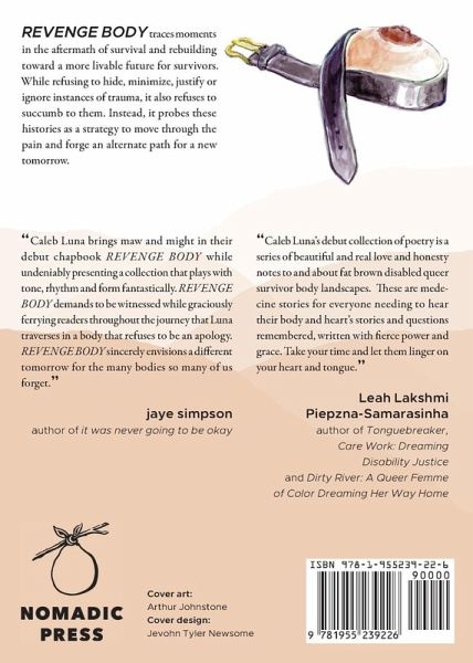 REVENGE BODY traces moments in the aftermath of survival and rebuilding toward a more livable future for survivors. While refusing to hide, minimize, justify or ignore instances of trauma, it also refuses to succumb to them. Instead, it probes these histories as a strategy to move through the pain and forge an alternate path for a new tomorrow.