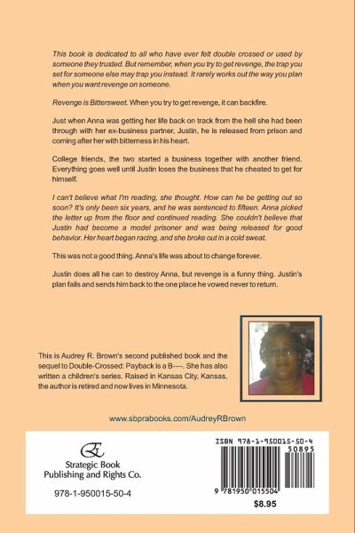 This book is dedicated to all who have ever felt double crossed or used by someone they trusted. But remember, when you try to get revenge, the trap you set for someone else may trap you instead. It rarely works out the way you plan when you want revenge on someone. Revenge is bittersweet. When you try to get revenge, it can backfire. Just when Anna was getting her life back on track from the hell she had been through with her ex-business partner, Justin, he is released from prison and coming after her with bitterness in his heart. College friends, the two started a business together with another friend. Everything goes well until Justin loses the business that he cheated to get for himself. I can't believe what I'm reading, she thought. How can he be getting out so soon? It's only been six years, and he was sentenced to fifteen. Anna picked the letter up from the floor and continued reading. She couldn't believe that Justin had become a model prisoner and was being released for good behavior. Her heart began racing, and she broke out in a cold sweat. This was not a good thing. Anna's life was about to change forever. Justin does all he can to destroy Anna, but revenge is a funny thing. Justin's plan fails and sends him back to the one place he vowed never to return. (About the Author) This is Audrey R. Brown's second published book and the sequel to Double-Crossed: Payback is a B----. She has also written a children's series. Raised in Kansas City, Kansas, the author is retired and now lives in Minnesota.