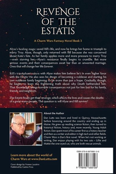 Alyse's healing magic saved Rill's life, and now he brings her home in triumph to marry Troy. Alyse, though, only returned with Rill because she was concerned about her cousin Kate's fate. As her family applies more and more pressure to marry Troy-even starving her-Alyse's resistance finally begins to crumble. But more serious events and their consequences await her than an unwanted marriage. Ones that will change her life forever. Rill's triumphant return with Alyse makes him believe he's in even higher favor with the Estatis. He also sees his dream of becoming a noblesse and starting his own noblesse family beginning to be more than just a hope. Gradually, though, he begins to learn the frightening truth about why Deuth befriended him. That knowledge brings horrible consequences not just for himself but for his family, friends, and neighbors too. The Estatis finally get their revenge. The question is: will Alyse and Rill survive? Read Book 3 in in the Charm Wars YA fantasy series and find out.