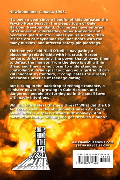 Newfoundland, Canada, 1993. It's been a year since a handful of kids defeated the Psycho Hose Beast in the sleepy town of Gale Harbour, Newfoundland. Our heroes have entered into the era of rollerblades, Super Nintendo and oversized plaid shirts... unless you're a goth, then it's the era of Maybelline eyeliner, boots with too many buckles, and infected safety-pin piercings. Thirteen-year-old Niall O'Neil is navigating a blossoming relationship with his crush, Harper Jeddore. Unfortunately, the power that allowed them to defeat the monster from the deep is still within them, and they are no closer to understanding or controlling it. When just touching your girlfriend can kill innocent bystanders, it complicates the already precarious practice of teenage dating. But lurking in the backdrop of teenage romance, a sinister power is growing in Gale Harbour, and dangerous people are turning up in the small town with possibly deadly intentions. Will the kids defeat this new threat? What did the US Air Force leave in the abandoned Hansen Air Force base? What is a space-surfing butt monkey? And most importantly-will anyone get to touch a boob?