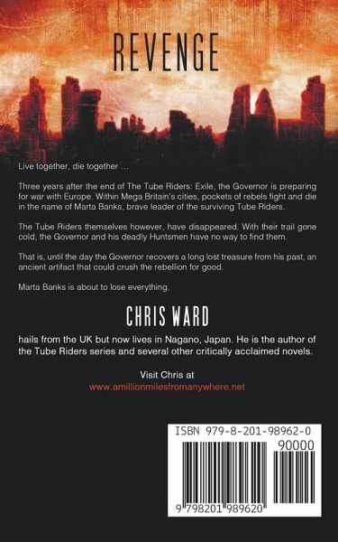 Live together, die together … Three years after the end of The Tube Riders: Exile, the Governor is preparing for war with Europe. Within Mega Britain's cities, pockets of rebels fight and die in the name of Marta Banks, brave leader of the surviving Tube Riders. The Tube Riders themselves though, have disappeared. With their trail gone cold, the Governor and his deadly Huntsmen have no way to find them. That is, until the day the Governor recovers a long lost treasure from his past, an ancient artifact that could crush the rebellion for good. Marta Banks is about to lose everything. The epic Tube Riders Trilogy concludes with The Tube Riders: Revenge.