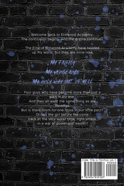 Welcome back to Elmwood Academy. The conclusion begins. And the drama continues. The Elite of Elmwood Academy have twisted up my world, but they are mine now. My family. My vengeance. My only way out of hell. Four guys who have become more than just a pain in my ass. And they all want the same thing as me. Revenge. But is there room for one more in our little pact? Or has the girl before me come back at the very worst time, right smack in a war of power and wealth?