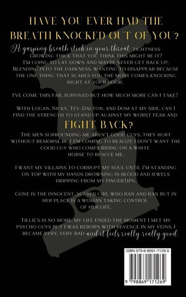 Have you ever had the breath knocked out of you? A gasping breath stuck in your throat, tightness growing so thick that you think this might be it? I'm going to lay down and maybe never get back up. Blending into the darkness, wanting to disappear because the one thing that scares you the most comes knocking right at your door. I've come this far and survived, but how much more can I take? With Logan, Nicky, Tey, Dalton, and Dom at my side, can I find the strength to stand up again and fight back? The men surrounding me aren't good guys. They hurt without remorse, but I'm coming to realize that I don't want the good guy who comes riding on a white horse to rescue me. I want my villains to corrupt my soul until I'm standing on top with my hands drowning in blood and jewels dripping from my fingertips. Gone is the innocent, scared girl who ran and ran. In her place is a woman taking control of her life. Tillie is no more. My life ended the moment I met my psycho guys, and I was reborn with revenge in my veins. I became very, very bad, and it feels really, really good.