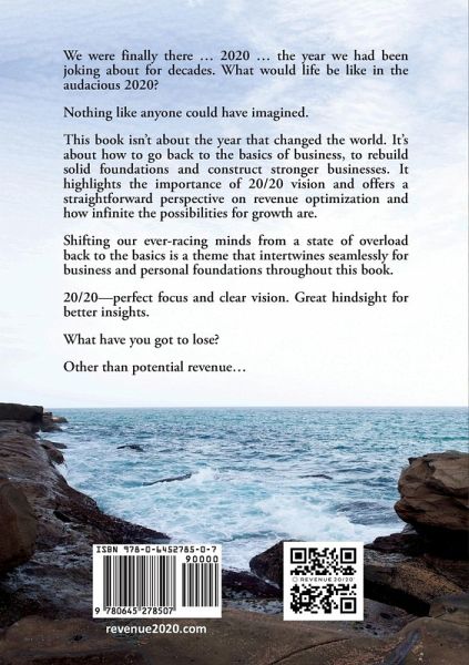 We were finally there ... 2020 ... the year we had been joking about for decades. What would life be like in the audacious 2020? Nothing like anyone could have imagined. This book isn't about the year that changed the world. It's about how to go back to the basics of business, to rebuild solid foundations and construct stronger businesses. It highlights the importance of 20/20 vision and offers a straightforward perspective on revenue optimization and how infinite the possibilities for growth are. Based on the steadfast money-making fundamentals that have stood the test of time for many situations and industries, Revenue 20/20 is a refreshing reminder to focus on the essentials. Shifting our ever-racing minds from a state of overload back to the basics is a theme that intertwines seamlessly for business and personal foundations throughout this book. 20/20-perfect focus and clear vision. Great hindsight for better insights. What have you got to lose? Other than potential revenue...