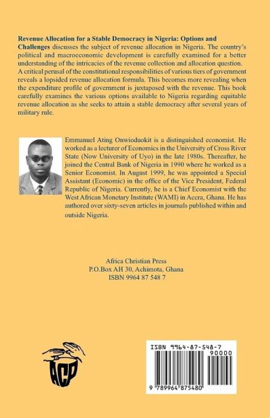 Nigeria's political and macroeconomic development is examined to provide better understanding of the intricacies of revenue collection and allocation. The author peruses the constitutional responsibilities of various tiers of government to expose its expenditure profile, which reveals lopsided revenue allocation formulae. He proceeds to examine the various ways in which Nigeria may allocate revenue more equitably, which he considers key to the project of attaining stable democracy after decades of military rule.
