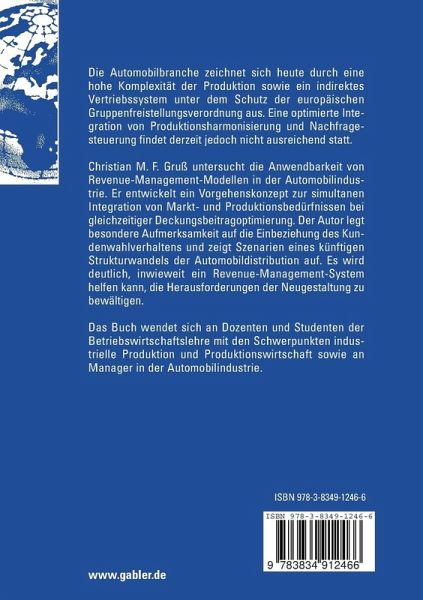Christian M.F. Gruß untersucht die Anwendbarkeit von Revenue-Management-Modellen in der Automobilindustrie. Er entwickelt ein Vorgehenskonzept zur simultanen Integration von Markt- und Produktionsbedürfnissen bei gleichzeitiger Deckungsbeitragoptimierung. Der Autor legt besondere Aufmerksamkeit auf die Einbeziehung des Kundenwahlverhaltens und zeigt Szenarien eines künftigen Strukturwandels der Automobildistribution auf. Es wird deutlich, inwieweit ein Revenue-Management-System helfen kann, die Herausforderungen der Neugestaltung zu bewältigen.