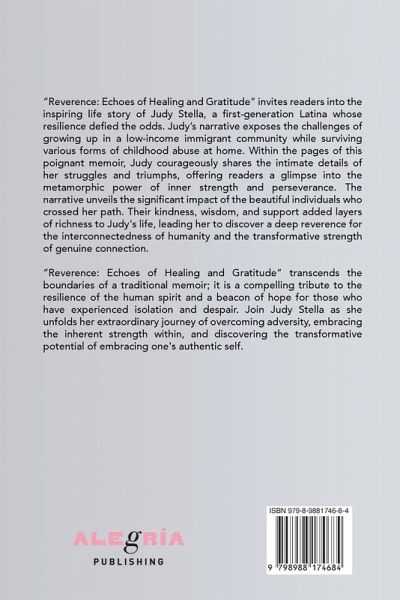 "Reverence: Echoes of Healing and Gratitude" invites readers into the inspiring life story of Judy Stella, a first-generation Latina whose resilience defied the odds. Judy's narrative exposes the challenges of growing up in a low-income immigrant community while surviving various forms of childhood abuse at home. Within the pages of this poignant memoir, Judy courageously shares the intimate details of her struggles and triumphs, offering readers a glimpse into the metamorphic power of inner strength and perseverance. The narrative unveils the significant impact of the beautiful individuals who crossed her path. Their kindness, wisdom, and support added layers of richness to Judy's life, leading her to discover a deep reverence for the interconnectedness of humanity and the transformative strength of genuine connection. "Reverence: Echoes of Healing and Gratitude" transcends the boundaries of a traditional memoir; it is a compelling tribute to the resilience of the human spirit and a beacon of hope for those who have experienced isolation and despair. Join Judy Stella as she unfolds her extraordinary journey of overcoming adversity, embracing the inherent strength within, and discovering the transformative potential of embracing one's authentic self.