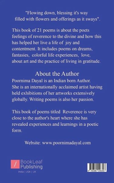 """"""Flowing down, blessing its way filled with flowers and offerings as it sways"""". This book of 21 poems and is about the poets feelings of reverence to the divine and how it has helped her live a life of joy and contentment. It includes poems on dreams, fantasies, colourful life experiences, love, about art and the practice of living in gratitude. Reverence, as the title suggests is the poets take on the act of reverence to God, which she believes is the true answer to living a joyous life.""