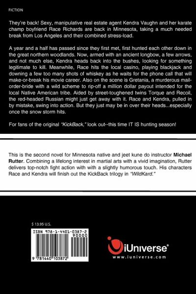 They're back! Sexy, manipulative real estate agent Kendra Vaughn and her karate champ boyfriend Race Richards are back in Minnesota, taking a much needed break from Los Angeles and their combined stress-load. A year and a half has passed since they first met, first hunted each other down in the great northern woodlands. Now, armed with an ancient longbow, a few arrows, and not much else, Kendra heads back into the bushes, looking for something legitimate to kill. Meanwhile, Race hits the local casino, playing blackjack and downing a few too many shot of whiskey as he waits for the phone call that will make-or-break his movie career. Also on the scene is Gretania, a murderous mail-order-bride with a wild scheme to rip-off a million dollar payout intended for the local Native American tribe. Aided by street-toughened twins Torque and Recoil, the red-headed Russian might just get away with it. Race and Kendra, pulled in by mistake, swing into action. But they just may be in over their heads...especially once the snow storm hits. For fans of the original "KickBack," look out--this time IT IS hunting season!