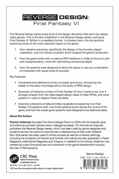 The Reverse Design series looks at all of the design decisions that went into classic video games. This is the first installment in the Reverse Design series, looking at Final Fantasy VI. Written in a readable format, it is broken down into six sections examining some of the most important topics to the game: How narrative elements, specifically the design of the fourteen player-characters, was the critical constraint which shaped the game's production How the game broke with numerous RPG traditions in order to focus on plot and characterization, while still maintaining mechanical depth How the systems were designed to allow the player to use any combination of characters with equal levels of success Key Features Comprehensive definitions of key concepts and terms, introducing the reader to the basic knowledge about the study of RPG design Summary of historical context of Final Fantasy VI how it came to be, how it diverges sharply from the class-based design ideas of older RPGs, and what systems in uses to replace those old ideas Extensive collections of data and data visualizations explaining how Final Fantasy VI's systems work, how those systems evolve across the course of the game, and how the overall game systems were designed to be balanced easily