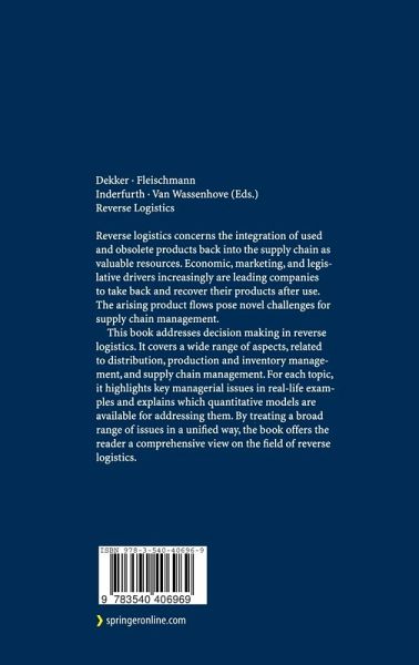 This book addresses decision making in reverse logistics. It covers a wide range of aspects, related to distribution, production and inventory management, and supply chain management. For each topic, it highlights key managerial issues in real-life examples and explains which quantitative models are available for addressing them. By treating a broad range of issues in a unified way, the book offers the reader a comprehensive view on the field of reverse logistics.