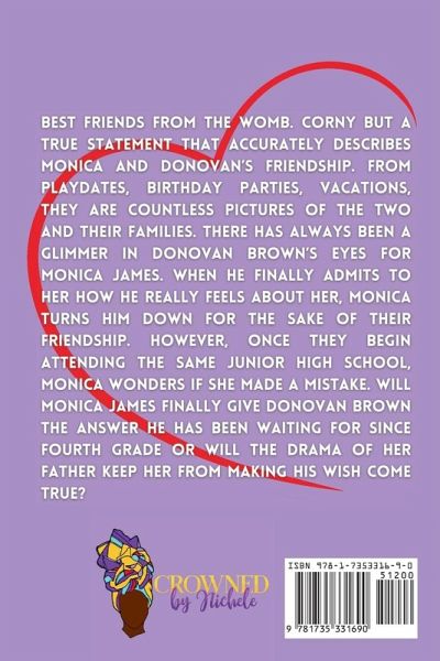 Best friends from the womb. Corny but a true statement that accurately describes Monica and Donovan's friendship. From playdates, birthday parties, vacations, they are countless pictures of the two and their families. There has always been a glimmer in Donovan Brown's eyes for Monica James. When he finally admits to her how he really feels about her, Monica turns him down for the sake of their friendship. However, once they begin attending the same junior high school (seventh grade), Monica wonders if she made a mistake. Will Monica James finally give Donovan Brown the answer he has been waiting for since fourth grade or will the drama of her father keep her from making his wish come true?