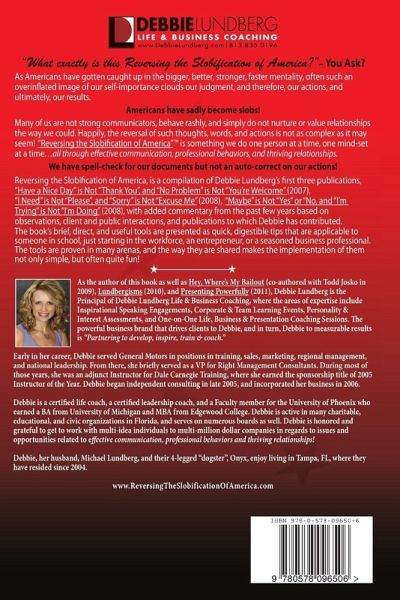 "What exactly is this "Reversing the Slobification of America!"? You ask? As Americans have gotten caught up in the bigger, stronger, faster, better mentality, often such an overinflated image of our self-importance clouds our judgment, and therefore, our actions, and ultimately, our results. Americans have sadly become slobs! Many of us are not strong communicators, behave rashly, and simply do not nurture and value relationships the way we could. Happily, the reversal of such thoughts, words, and actions is not as complex as it may seem like something we do one person at a time, one mindset at a time...all through effective communication, professional behaviors, and thriving relationships. There is a spell-check for our documents and no auto-correct for our behaviors. This book, Reversing the Slobification of America, is a compilation of Debbie Lundberg's first three publications for someone in school, just starting in the workforce, an entrepreneur, or a seasoned business professional.