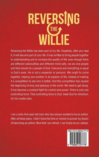 Reversing the Willie has been part of my life. Hopefully, after you read it, it will become part of your life. It was written to bring people together in understanding and to increase the quality of life; even though there are different nationalities and different mind-sets, we are one people and that should be a people of God. Everyone and everything is equal in God's eyes. He is not a respecter or persons. We ought to come together, helping one another in all aspects of life, instead of making it a competition to see who is better. And this competition has caused the beginning of envy and jealousy in the world. We need to get along, it has become a constant fight for control and power. There is only one controlling force. That controlling force is God. Seek God for direction; for his master plan.