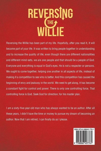 Reversing the Willie has been part of my life. Hopefully, after you read it, it will become part of your life. It was written to bring people together in understanding and to increase the quality of life; even though there are different nationalities and different mind-sets, we are one people and that should be a people of God. Everyone and everything is equal in God's eyes. He is not a respecter or persons. We ought to come together, helping one another in all aspects of life, instead of making it a competition to see who is better. And this competition has caused the beginning of envy and jealousy in the world. We need to get along, it has become a constant fight for control and power. There is only one controlling force. That controlling force is God. Seek God for direction; for his master plan.