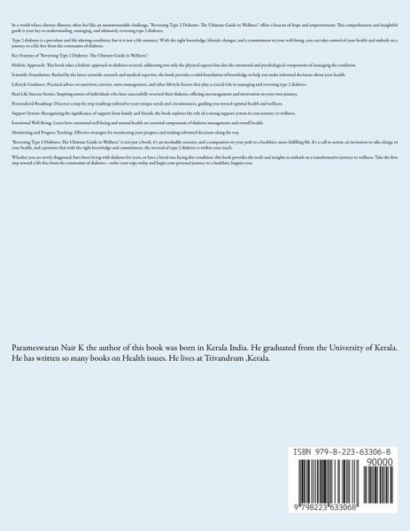 In a world where chronic illnesses often feel like an insurmountable challenge, "Reversing Type 2 Diabetes: The Ultimate Guide to Wellness" offers a beacon of hope and empowerment. This comprehensive and insightful guide is your key to understanding, managing, and ultimately reversing type 2 diabetes. Type 2 diabetes is a prevalent and life-altering condition, but it is not a life sentence. With the right knowledge, lifestyle changes, and a commitment to your well-being, you can take control of your health and embark on a journey to a life free from the constraints of diabetes. Key Features of "Reversing Type 2 Diabetes: The Ultimate Guide to Wellness": Holistic Approach: This book takes a holistic approach to diabetes reversal, addressing not only the physical aspects but also the emotional and psychological components of managing the condition. Scientific Foundation: Backed by the latest scientific research and medical expertise, the book provides a solid foundation of knowledge to help you make informed decisions about your health. Lifestyle Guidance: Practical advice on nutrition, exercise, stress management, and other lifestyle factors that play a crucial role in managing and reversing type 2 diabetes. Real-Life Success Stories: Inspiring stories of individuals who have successfully reversed their diabetes, offering encouragement and motivation on your own journey. Personalized Roadmap: Discover a step-by-step roadmap tailored to your unique needs and circumstances, guiding you toward optimal health and wellness. Support System: Recognizing the significance of support from family and friends, the book explores the role of a strong support system in your journey to wellness. Emotional Well-Being: Learn how emotional well-being and mental health are essential components of diabetes management and overall health. Monitoring and Progress Tracking: Effective strategies for monitoring your progress and making informed decisions along the way. "Reversing Type 2 Diabetes: The Ultimate Guide to Wellness" is not just a book; it's an invaluable resource and a companion on your path to a healthier, more fulfilling life. It's a call to action, an invitation to take charge of your health, and a promise that with the right knowledge and commitment, the reversal of type 2 diabetes is within your reach. Whether you are newly diagnosed, have been living with diabetes for years, or have a loved one facing this condition, this book provides the tools and insights to embark on a transformative journey to wellness. Take the first step toward a life free from the constraints of diabetes-order your copy today and begin your personal journey to a healthier, happier you.