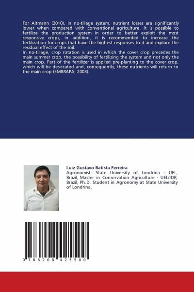 For Altmann (2010), in no-tillage system, nutrient losses are significantly lower when compared with conventional agriculture. It is possible to fertilize the production system in order to better exploit the most responsive crops, in addition, it is recommended to increase the fertilization for crops that have the highest responses to it and explore the residual effect of the soil.In no-tillage, crop rotation is used in which the cover crop precedes the main summer crop, the possibility of fertilizing the system and not only the main crop. Part of the fertilizer is applied pre-planting to the cover crop, which will be desiccated and, consequently, these nutrients will return to the main crop (EMBRAPA, 2003).