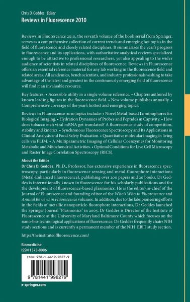 Reviews in Fluorescence 2010, the seventh volume of the book serial from Springer, serves as a comprehensive collection of current trends and emerging hot topics in the field of fluorescence and closely related disciplines. It summarizes the year's progress in fluorescence and its applications, with authoritative analytical reviews specialized enough to be attractive to professional researchers, yet also appealing to the wider audience of scientists in related disciplines of fluorescence. Reviews in Fluorescence offers an essential reference material for any lab working in the fluorescence field and related areas. All academics, bench scientists, and industry professionals wishing to take advantage of the latest and greatest in the continuously emerging field of fluorescence will find it an invaluable resource. Key features: Accessible utility in a single volume reference. chapters authored by known leading figures in the fluorescence field, new volume publishes annually, comprehensive coverage of the year's hottest and emerging topics, each Reviews in Fluorescence volume is citable (ISI) and indexed. Reviews in Fluorescence 2010 topics include: Novel Metal-based Luminophores for Biological Imaging. hydration Dynamics of Probes and Peptides in Captivity, how does tobacco etch viral mRNA get translated? A fluorescence study of competition, stability and kinetics, synchronous Fluorescence Spectroscopy and Its Applications in Clinical Analysis and Food Safety Evaluation, quantitative molecular imaging in living cells via FLIM, a Multiparametric Imaging of Cellular Coenzymes for Monitoring Metabolic and Mitochondrial Activities, optimal Conditions for Live Cell Microscopy and Raster Image Correlation Spectroscopy (RICS).