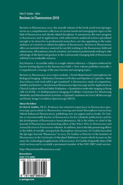 Reviews in Fluorescence 2010, the seventh volume of the book serial from Springer, serves as a comprehensive collection of current trends and emerging hot topics in the field of fluorescence and closely related disciplines. It summarizes the year's progress in fluorescence and its applications, with authoritative analytical reviews specialized enough to be attractive to professional researchers, yet also appealing to the wider audience of scientists in related disciplines of fluorescence. Reviews in Fluorescence offers an essential reference material for any lab working in the fluorescence field and related areas. All academics, bench scientists, and industry professionals wishing to take advantage of the latest and greatest in the continuously emerging field of fluorescence will find it an invaluable resource. Key features: Accessible utility in a single volume reference. chapters authored by known leading figures in the fluorescence field, new volume publishes annually, comprehensive coverage of the year's hottest and emerging topics, each Reviews in Fluorescence volume is citable (ISI) and indexed. Reviews in Fluorescence 2010 topics include: Novel Metal-based Luminophores for Biological Imaging. hydration Dynamics of Probes and Peptides in Captivity, how does tobacco etch viral mRNA get translated? A fluorescence study of competition, stability and kinetics, synchronous Fluorescence Spectroscopy and Its Applications in Clinical Analysis and Food Safety Evaluation, quantitative molecular imaging in living cells via FLIM, a Multiparametric Imaging of Cellular Coenzymes for Monitoring Metabolic and Mitochondrial Activities, optimal Conditions for Live Cell Microscopy and Raster Image Correlation Spectroscopy (RICS).
