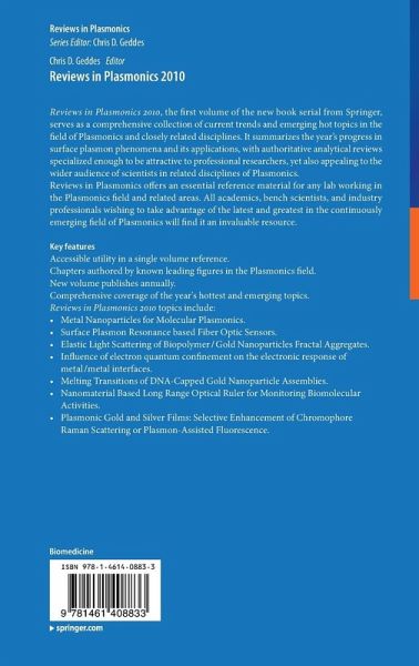 Key features: Accessible utility in a single volume reference. Chapters authored by known leading figures in the Plasmonics field.New volume publishes annually.Comprehensive coverage of the year's hottest and emerging topics. Reviews in Plasmonics 2011 topics include: Metal Nanoparticles for Molecular Plasmonics. Surface Plasmon Resonance based Fiber Optic Sensors.Elastic Light Scattering of Biopolymer/Gold Nanoparticles Fractal Aggregates. Influence of electron quantum confinement on the electronic response of metal/metal interfaces.Melting Transitions of DNA-Capped Gold Nanoparticle Assemblies.Nanomaterial Based Long Range Optical Ruler for Monitoring Biomolecular Activities. Plasmonic Gold and Silver Films: Selective Enhancement of Chromophore Raman Scattering or Plasmon-Assisted Fluorescence.