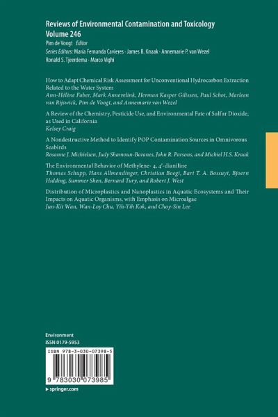 1. How to adapt chemical risk assessment for unconventional hydrocarbon extraction related to the water system.- 2. A Review of the Chemistry, Pesticide Use and Environmental Fate of Sulfur Dioxide, as Used in California.- 3. A non-destructive method to identify POP contamination sources in omnivorous seabirds.- 4. The Environmental Behaviour of Methylene-4,4'-dianiline (MDA).- 5. Distribution of Microplastics and Nanoplastics in Aquatic Ecosystems and their Impacts on Aquatic Organisms, with Emphasis on Microalgae.