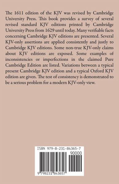 Evidence that the 1611 KJV edition has been revised. Survey of revised standard KJV editions printed by Cambridge University Press from 1629 until today; verifiable facts concerning Cambridge KJV editions; response to KJV-only assertions concerning Cambridge KJV editions; examination of claimed Pure Cambridge Edition including its inconsistencies. Six varying 2011 Cambridge KJV editions are examined. Several incorrect and non-true KJV-only claims concerning KJV editions are exposed and refuted. The test of consistency is demonstrated to be a serious problem for a modern KJV-only view.
