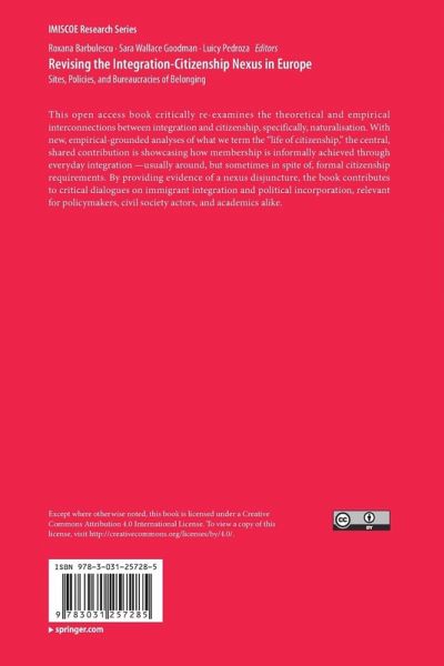 1. Conceptualising the Citizenship-Integration Nexus (Roxana Barbulescu, Sara Wallace Goodman, and Luicy Pedroza).- Part 1. Integration Through Citizenship.- 2. Ideas of integration in citizenship laws and citizenship acquisition procedures in Belgium and the UK (Djordje Sredanovic).- 3. Becoming Dutch at what cost? Increasing application fees and naturalisation rates of EU immigrants in the Netherlands (Floris Peters, Swantje Falcke and Maarten Vink).- 4. Citizenship and naturalisation for migrants in the UK after Brexit (Marina Fernandez Reino and Madeleine Sumption).- Part 2. Integration from Below.- 5. Immigrant Economic Rights in the European Union (Hannah M. Alarian).- 6. Migrants, New citizens, Co-citizens and citizens by adoption - Regionalist parties' framing of immigrants in the Basque Country, Corsica, South Tyrol, Scotland and Wales (Verena Wisthaler).- 7. Intercultural Citizenship in the Making: Public Space and Belonging in Discriminatory Environments (Richard Zapata-Barrero and Zenia Hellgren).- 8. "In London, I am a European citizen": Brexit, emotions, and the politics of belonging (Nando Sigona and Marie Godin).- Part 3. Integration from Above.- 9. "It just feels weird" - Irish External Voting and the 'Brexit Irish' (Vikki Barry Brown).- 10. Between Integration and Dissociation: Intra-European Immigrants' Life Experiences in Romania (Bogdan Voicu and Alin Croitoru).- 11. EU Citizenship: A Tool for Integration? (Sara Wallace Goodman.