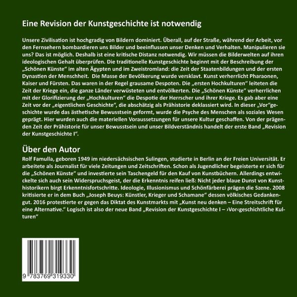 Eine Revision der Kunstgeschichte ist notwendig Unsere Zivilisation ist hochgradig von Bildern dominiert. Überall, auf der Straße, während der Arbeit vor dem Fernsehen bombardieren uns Bilder und beeinflussen unser Denken und Verhalten. Manipulieren sie uns? Das ist möglich. Deshalb ist eine kritische Distanz notwendig. Wir müssen die Bilderwelten auf ihren ideologischen Gehalt überprüfen. Die traditionelle Kunstgeschichte beginnt mit der Beschreibung der Schönen Künste im alten Ägypten und im Zweistromland. Das war aber die Zeit der Staatenbildung und der Errichtung der ersten Dynastien der Menschheit. Die Masse der Bevölkerung wurde versklavt. Kunst verherrlicht Pharaonen, Kaiser und Fürsten. Das waren in der Regel grausame Despoten. Die ersten Hochkulturen leiteten die Zeit der Kriege ein, die ganze Länder verwüsteten und entvölkerten. Die Schönen Künste verherrlichen mit der Glorifizierung der Hochkulturen die Despotie der Herrscher und ihrer Kriege. Es gab aber eine Zeit vor der eigentlichen Geschichte, die abschätzig als Prähistorie deklassiert wird. In dieser Vorgeschichte wurde das ästhetische Bewusstsein geformt, wurde die Psyche des Menschen als soziales Wesen geprägt. Hier wurden auch die materiellen Voraussetzungen für unsere Kultur geschaffen. Von der prägenden Zeit der Prähistorie für unser Bewusstsein und unseres Bildverständnisses handelt der erste Band Revision der Kunstgeschichte I