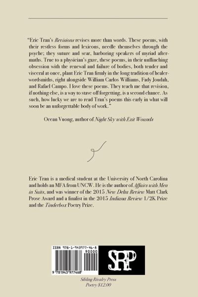 "Eric Tran's Revisions revises more than words. These poems, with their restless forms and lexicons, needle themselves through the psyche; they suture and sear, harboring speakers of myriad aftermaths. True to a physician's gaze, these poems, in their unflinching obsession with the renewal and failure of bodies, both tender and visceral at once, plant Eric Tran firmly in the long tradition of healer-wordsmiths, right alongside William Carlos Williams, Fady Joudah, and Rafael Campo. I love these poems. They teach me that revision, if nothing else, is a way to stave off forgetting, is a second chance. As such, how lucky we are to read Tran's poems this early in what will soon be an unforgettable body of work." - Ocean Vuong, author of Night Sky with Exit Wounds