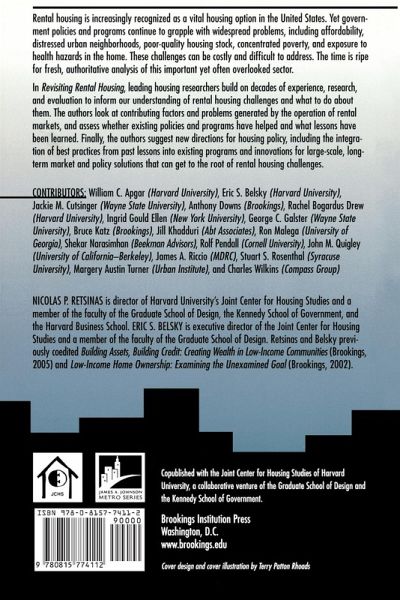 " A Brookings Institution Press and Harvard University Joint Center for Housing Studies publication Rental housing is increasingly recognized as a vital housing option in the United States. Government policies and programs continue to grapple with problematic issues, however, including affordability, distressed urban neighborhoods, concentrated poverty, substandard housing stock, and the unmet needs of the disabled, the elderly, and the homeless. In R evisiting Rental Housing, leading housing researchers build upon decades of experience, research, and evaluation to inform our understanding of the nation's rental housing challenges and what can be done about them. It thoughtfully addresses not only present issues affecting rental housing, but also viable solutions. The first section reviews the contributing factors and primary problems generated by the operation of rental markets. In the second section, contributors dissect how policies and programs haveor have notdealt with the primary challenges; what improvementsif anyhave been gained; and the lessons learned in the process. The final section looks to potential new directions in housing policy, including integrating best practices from past lessons into existing programs, and new innovations for large-scale, long-term market and policy solutions that get to the root of rental housing challenges. Contributors include William C. Apgar (Harvard University), Anthony Downs (Brookings), Rachel Drew (Harvard University), Ingrid Gould Ellen (New York University), George C. Galster (Wayne State University), Bruce Katz (Brookings), Jill Khadduri (Abt Associates), Shekar Narasimhan (Beekman Advisors), Rolf Pendall (Cornell University), John M. Quigley (University of CaliforniaBerkeley), James A. Riccio (MDRC), Stuart S. Rosenthal (Syracuse University), Margery Austin Turner (Urban Institute), and Charles Wilkins (Compass Group). "