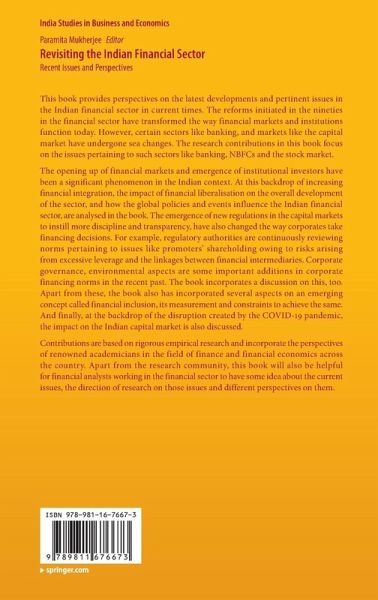 The opening up of financial markets and emergence of institutional investors have been a significant phenomenon in the Indian context. At this backdrop of increasing financial integration, the impact of financial liberalisation on the overall development of the sector, and how the global policies and events influence the Indian financial sector, are analysed in the book. The emergence of new regulations in the capital markets to instill more discipline and transparency,have also changed the way corporates take financing decisions. For example, regulatory authorities are continuously reviewing norms pertaining to issues like promoters' shareholding owing to risks arising from excessive leverage and the linkages between financial intermediaries. Corporate governance, environmental aspects are some important additions in corporate financing norms in the recent past. The book incorporates a discussion on this, too. Apart from these, the book also has incorporated several aspects on an emerging concept called financial inclusion, its measurement and constraints to achieve the same. And finally, at the backdrop of the disruption created by the COVID-19 pandemic, the impact on the Indian capital market is also discussed.