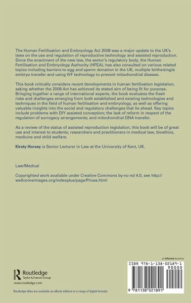 The Human Fertilisation and Embryology Act 2008 was a major update to the UK's laws on the use and regulation of reproductive technology and assisted reproduction. Since the enactment of the new law, the sector's regulatory body, the Human Fertilisation and Embryology Authority (HFEA), has also consulted on various related topics including barriers to egg and sperm donation in the UK, multiple births/single embryo transfer and using IVF technology to prevent mitochondrial disease. This book critically considers recent developments in human fertilisation legislation, asking whether the 2008 Act has achieved its stated aim of being fit for purpose. Bringing together a range of international experts, the book evaluates the fresh risks and challenges emerging from both established and existing technologies and techniques in the field of human fertilisation and embryology, as well as offering valuable insights into the social and regulatory challenges that lie ahead. Key topics include problems with DIY assisted conception; the lack of reform in respect of the regulation of surrogacy arrangements; and mitochondrial DNA transfer. As a review of the status of assisted reproduction legislation, this book will be of great use and interest to students, researchers and practitioners in medical law, bioethics, medicine and child welfare.