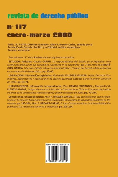 REVISTA DE DERECHO PÚBLICO, ISSN: 1317-2719. Director-Fundador: Allan R. Brewer-Carías, editada por la Fundación de Derecho Público y la Editorial Jurídica Venezolana. Nº 117, enero marzo 2009, Caracas Venezuela: Este número. 117 de la Revista tiene el siguiente contenido: Artículos: Claudia CAPUTI, La responsabilidad del Estado en la Argentina -Una reseña panorámica de sus principales cuestiones en la actualidad, pp. 7-44; Armando RODRÍGUEZ GARCÍA, Libertad, Estado y Derecho Administrativo. El papel del Derecho Administrativo en la modernidad democrática, pp. 45-60;. LEGISLACIÓN: Información Legislativa: Marianella VILLEGAS SALAZA, Leyes, Decretos Normativos, Reglamentos y Resoluciones de efectos generales dictados durante primer trimestre de 2009, pp. 63-74 JURISPRUDENCIA. Información Jurisprudencia, Mary RAMOS FERNÁNDEZ y Marianella VILLEGAS SALAZAR, Jurisprudencia Administrativa y Constitucional (Tribunal Supremo de Justicia y Cortes de lo Contencioso Administrativo): primer trimestre de 2009, pp. 77-194. Comentarios Jurisprudenciales: Allan R. BREWER-CARÍAS, pp. 195-214.