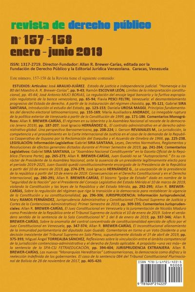 REVISTA DE DERECHO PÚBLICO, ISSN: 1317-2719. Director-Fundador: Allan R. Brewer-Carías, editada por la Fundación de Derecho Público y la Editorial Jurídica Venezolana. Nº 157-158, enero-junio 2019, Caracas Venezuela: Este número. 1157-158 de la Revista tiene el siguiente contenido: Artículos: José ARAUJO-JUÁREZ, Estado de justicia e independencia judicial. "Homenaje a los 80 del Maestro A. R. Brewer-Carías", pp. 9-44; Ramón ESCOVAR LEÓN, constitucional, pp. 45-64; José Antonio MUCI BORJAS, La regulación del encaje legal bancario y la furtiva expropiación regulatoria de la banca venezolana, pp. 65- 94; Flavia PESCI FELTRI, Venezuela: el desmantelamiento progresivo del Estado de derecho. A partir de la instauración del régimen chavista, pp. 95-122; Gabriel SIRA SANTANA, Introducción al estudio del Estado, pp. 123-154; Daniela UROSA MAGGI, Principios fundamentales del derecho electoral latinoamericano, pp. 155-170; María Auxiliadora ANDRADE, La innegable ruptura de la política exterior de Venezuela a partir de la Constitución de 1999, pp, 171-184. Comentarios Monográficos: Allan R. BREWER-CARÍAS, El régimen en su laberinto y la Asamblea Nacional al rescate de la democracia (enero 2019), pp. 187-207; José Ignacio HERNÁNDEZ G, El contrato administrativo en el derecho administrativo global. Una perspectiva Iberoamericana, pp. 208-224; J. Gerson REVANALES M, La jurisdicción, la competencia y el procedimiento en la Corte Internacional de Justicia en el caso de la demanda de la Republica Cooperativa de Guyana por la Reclamación del Esequibo y el Acuerdo de Ginebra de 1966, pp. 225-236. LEGISLACIÓN: Información Legislativa: Gabriel SIRA SANTANA, Leyes, Decretos Normativos, Reglamentos y Resoluciones de efectos generales dictados durante primer semestre de 2019, pp. 239-24. Comentarios Legislativos: por Gabriel SIRA SANTANA, Allan R. BREWER-CARÍAS, José Ignacio HERNÁNDEZ G. pp. 265-305. JURISPRUDENCIA. Información Jurisprudencia, Mary RAMOS FERNÁNDEZ, Jurisprudencia Administrativa y Constitucional (Tribunal Supremo de Justicia y Cortes de lo Contencioso Administrativo): primer semestre de 2019, pp. 307-336. comentarios Jurisprudenciales: por Allan R. BREWER-CARÍAS y Ángel TORREALBA SÁNCHEZ pp. 337- 415.