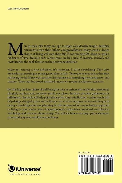 Men in their 60s today are apt to enjoy considerably longer, healthier retirements than their fathers and grandfathers. Many stand a decent chance of living well into their 80s if not reaching 90, doing so with a modicum of style. Because one's senior years can be a time of promise, renewal, and revitalization the book focuses on the positive possibilities. Many are creating a new definition of retirement. I call it revitalizing. They view themselves as entering an exciting, new phase of life. They want to be active, rather than risk being bored. Many want to make the transition to something new, productive, and creative. There may be second and third careers, or a series of volunteer activities. By offering the four pillars of well-being for men in retirement: existential, emotional, physical, and financial, concisely and in one place, the book provides guideposts for fulfillment. The book will help point the way for your revitalization - a new you. It will help design a longevity plan for the life you want to live that goes far beyond the typical money-crunching retirement planning. It reflects the need for a more holistic approach to living in your senior years, integrating one's aspirations, emotional and physical well-being, and concerns about money. You will see how to develop: your existential, emotional, physical, and financial wellness.