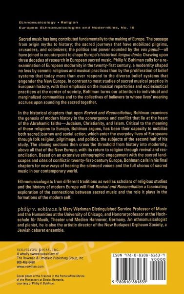 Sacred music has long contributed fundamentally to the making of Europe. The passage from origin myths to history, the sacred journeys that have mobilized pilgrims, crusaders, and colonizers, the politics and power sounded by the vox populi-all have joined in counterpoint to shape Europe's historical longue duree. Drawing upon three decades of research in European sacred music, Philip V. Bohlman calls for a reexamination of European modernity in the twenty-first century, a modernity shaped no less by canonic religious and musical practices than by the proliferation of belief systems that today more than ever respond to the diverse belief systems that engender the New Europe. In contrast to most studies of sacred musical practice in European history, with their emphasis on the musical repertories and ecclesiastical practices at the center of society, Bohlman turns our attention to individual and marginalized communities and to the collectives of believers to whose lives meaning accrues upon sounding the sacred together. In the historical chapters that open Revival and Reconciliation, Bohlman examines the genesis of modern history in the convergence and conflict that lie at the heart of the Abrahamic faiths-Judaism, Christianity, and Islam. Critical to the meaning of these religions to Europe, Bohlman argues, has been their capacity to mobilize both sacred journey and social action, which enter the everyday lives of Europeans through folk religion, pilgrimage, and politics, the subjects of the second half of his study. The closing sections then cross the threshold from history into modernity, above all that of the New Europe, with its return to religion through revival and reconciliation. Based on an extensive ethnographic engagement with the sacred landscapes and sites of conflict in twenty-first-century Europe, Bohlman calls in his final chapters for new ways of hearing the silenced voices and the full chorus of sacred music in our contemporary world. Ethnomusicologists from different traditions as well as scholars of religious studies and the history of modern Europe will find Revival and Reconciliation a fascinating exploration of the connections between sacred music and the role it plays in the formations of the modern self.
